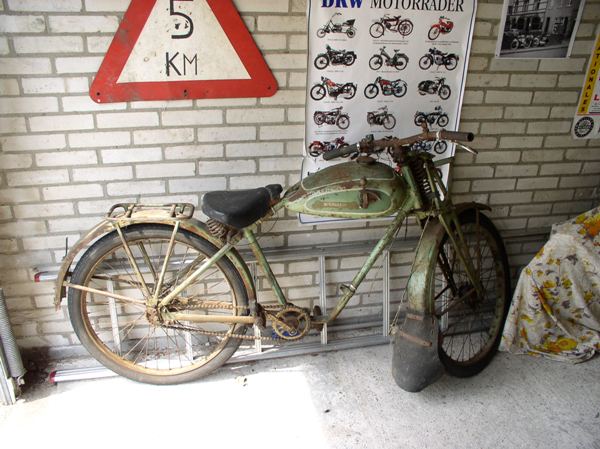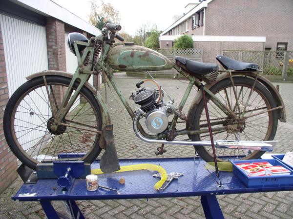 Van Peter de Ruiter gekregen. Veel moest er bij gezocht worden, nagenoeg alles ontbrak. De volgende onderdelen zijn gevonden: nieuw zadeldek, ontsteking, schakelstang, kettingkast, ketting, koplamp, schakelaars licht). Inmiddels zover dat er over gegaan kan worden tot definitieve restauratie. In Radevormwald geweest om te fotograferen hoe de motor er uit moet zien. Inmiddels zijn de kleuren nrs. ook bekend.