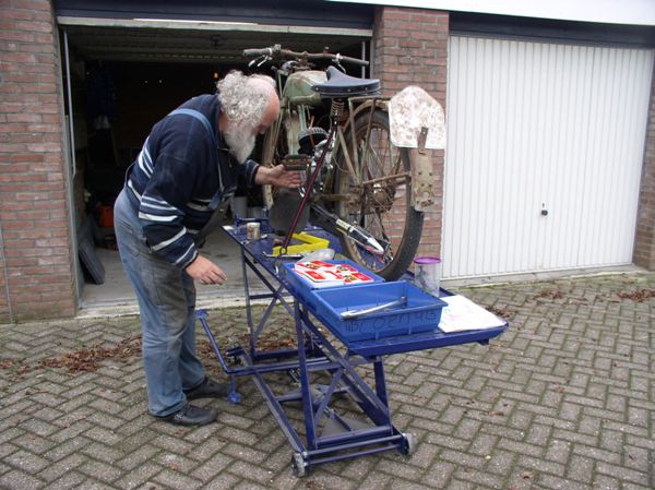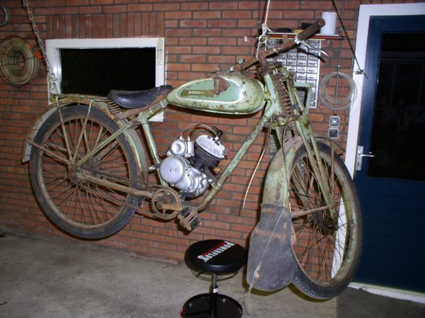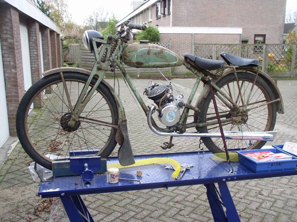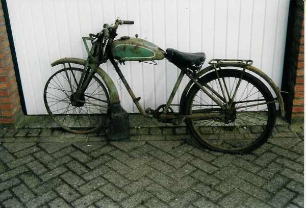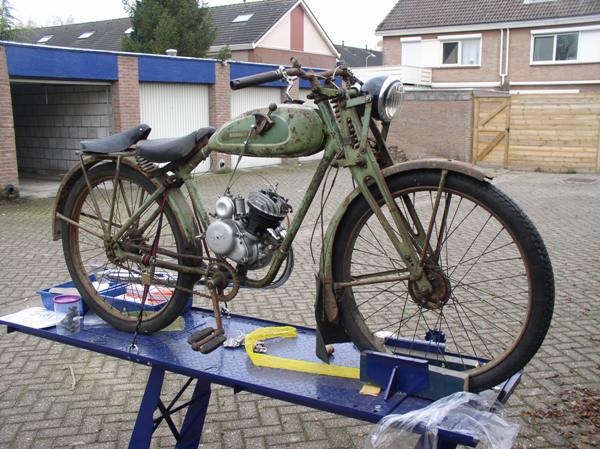 Van Peter de Ruiter gekregen. Veel moest er bij gezocht worden, nagenoeg alles ontbrak. De volgende onderdelen zijn gevonden: nieuw zadeldek, ontsteking, schakelstang, kettingkast, ketting, koplamp, schakelaars licht). Inmiddels zover dat er over gegaan kan worden tot definitieve restauratie. In Radevormwald geweest om te fotograferen hoe de motor er uit moet zien. Inmiddels zijn de kleuren nrs. ook bekend. |