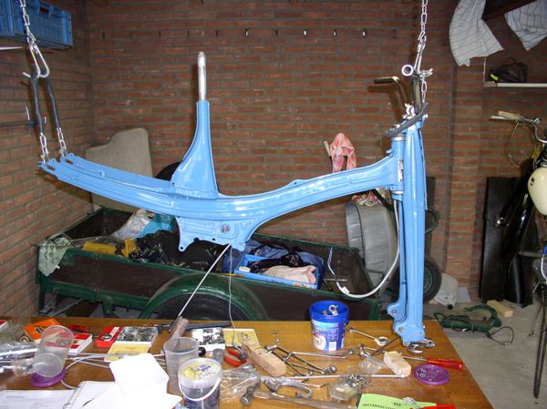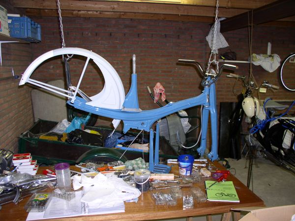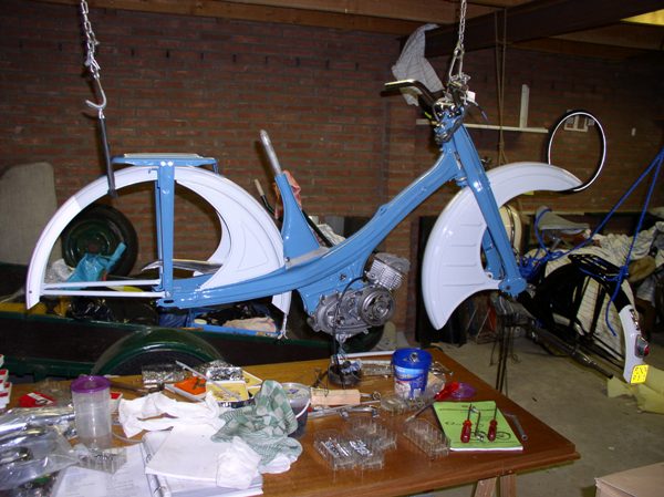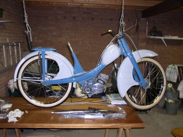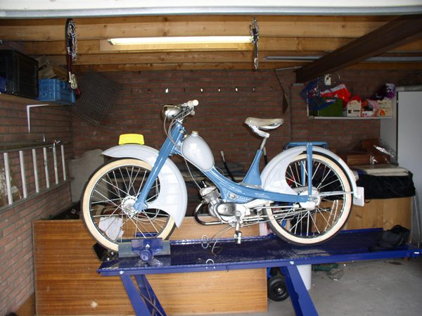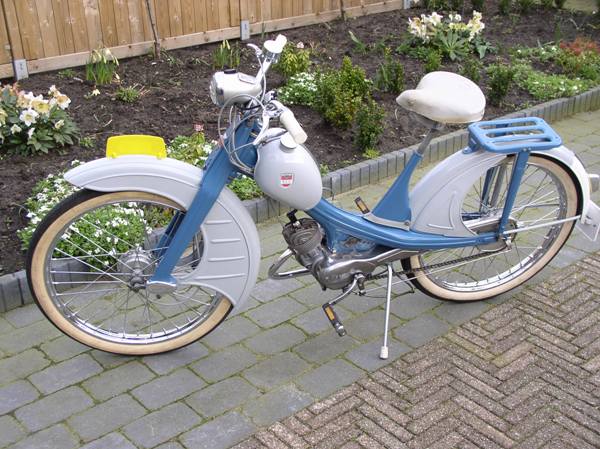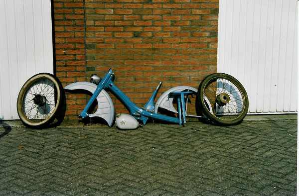 Met een dergelijke NSU maakten mijn ouders reizen door Europa. Het was erg moeilijk om een Van Oorschot NSU te vinden met halve naven en 25 inch wielen. De oude foto’s gaven echter aan dat de bromfiets toen halve naven had. Daarom werd besloten er zelf zo een te bouwen. De totale restauratie (incl zoektocht) nam 5 jaar in beslag. |